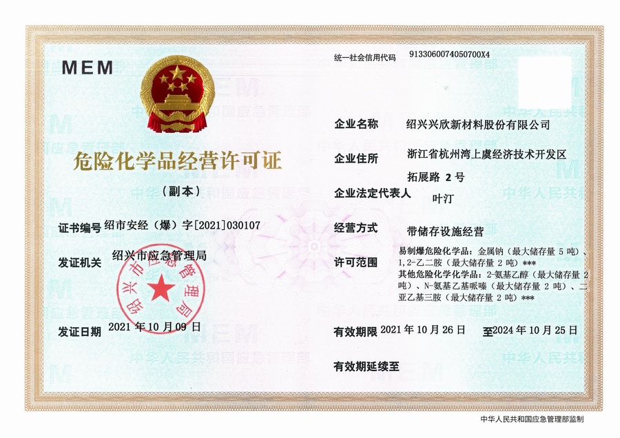 紹興興欣新材料股份有限公司成立于2002年06月27日,占地面積122畝,位于杭州灣上虞經濟技術開發區拓展路2號,現有職工200余人,專業技術人員50余人;博士、碩士研究生30余人組成的一支知識型、專業化的技術科研團隊。公司面向全球市場,專業開發電子化學品、環保化學品、醫藥中間體、高分子材料等先進新材料重點領域的省級科技型企業;建有浙江上虞、安徽東至兩個生產基地。目前為“國家高新技術企業”、浙江省“隱形冠軍”企業、浙江省專精特新中小企業;建有“省級”研究開發中心,共建天津大學浙江紹興研究院電子化學品研發中心。